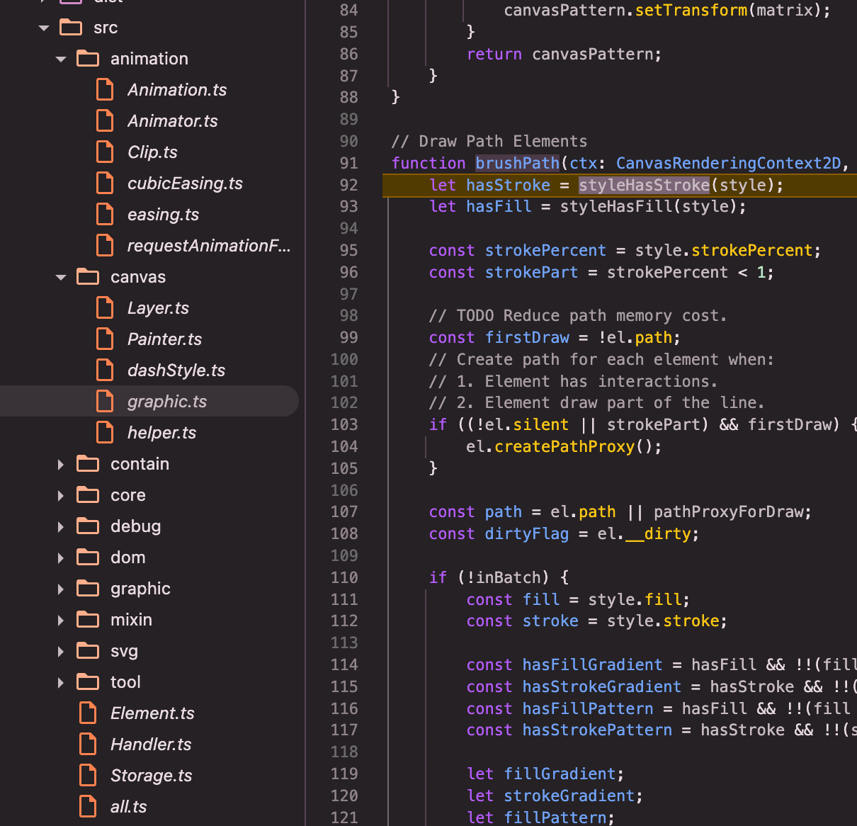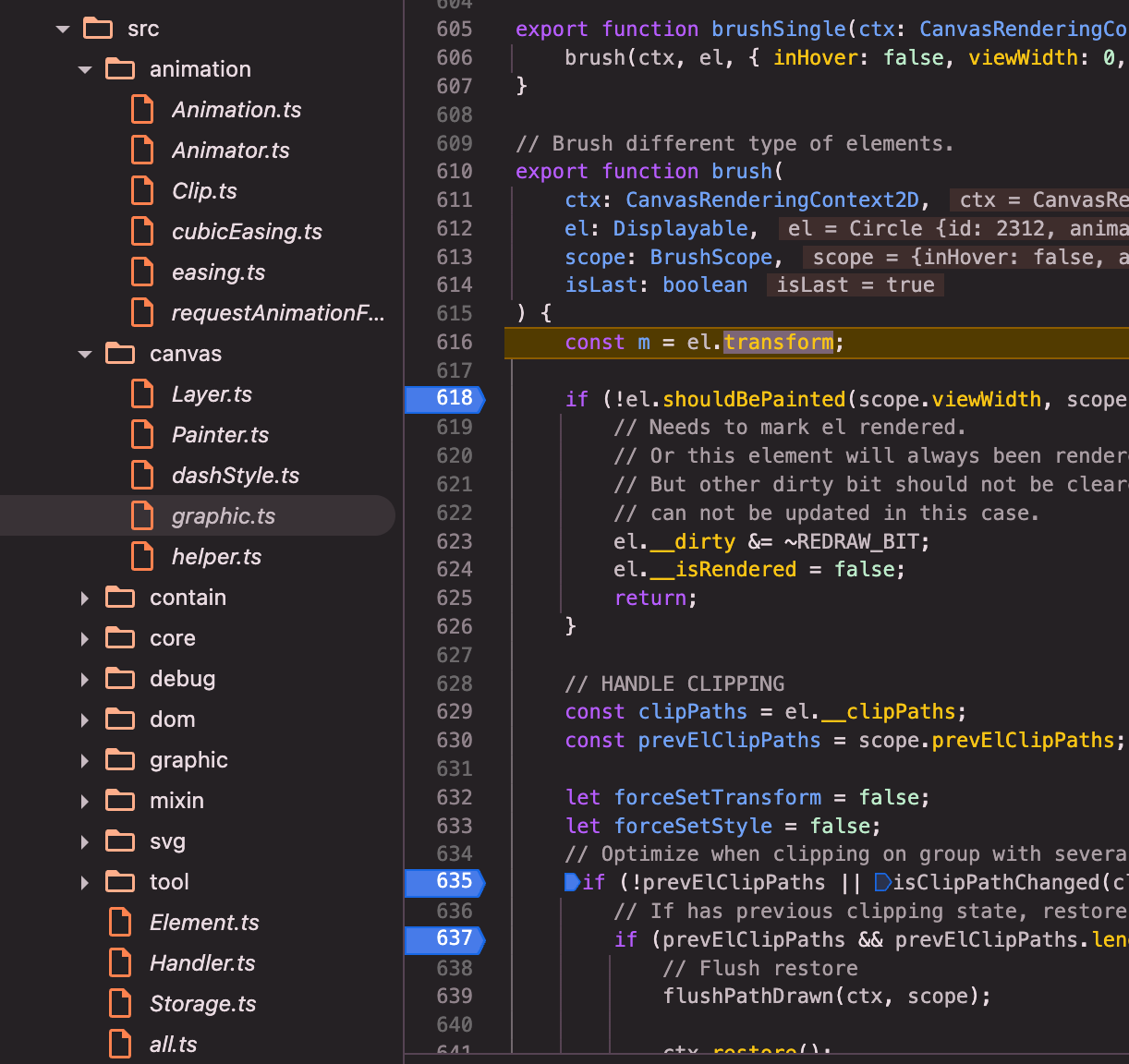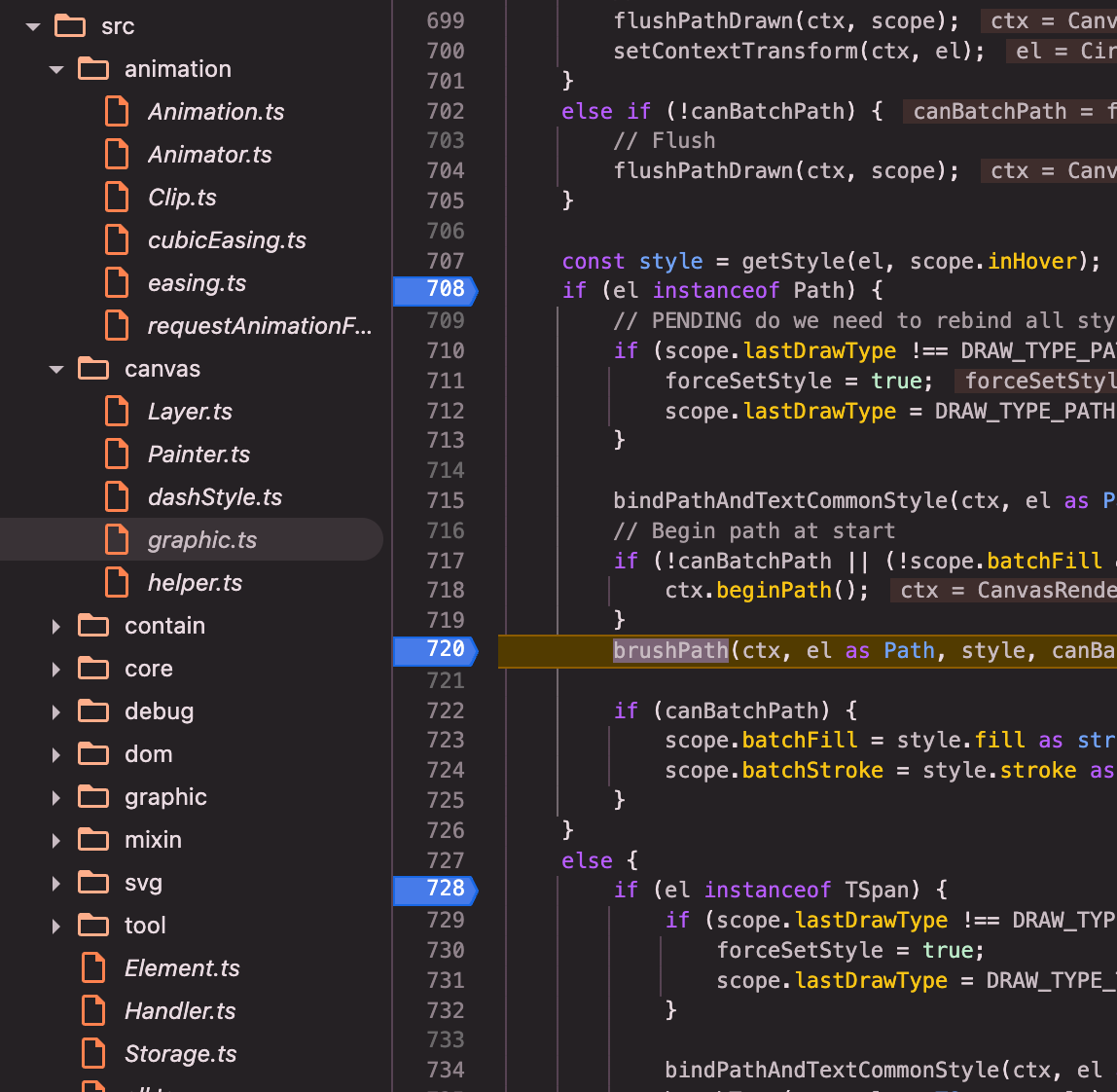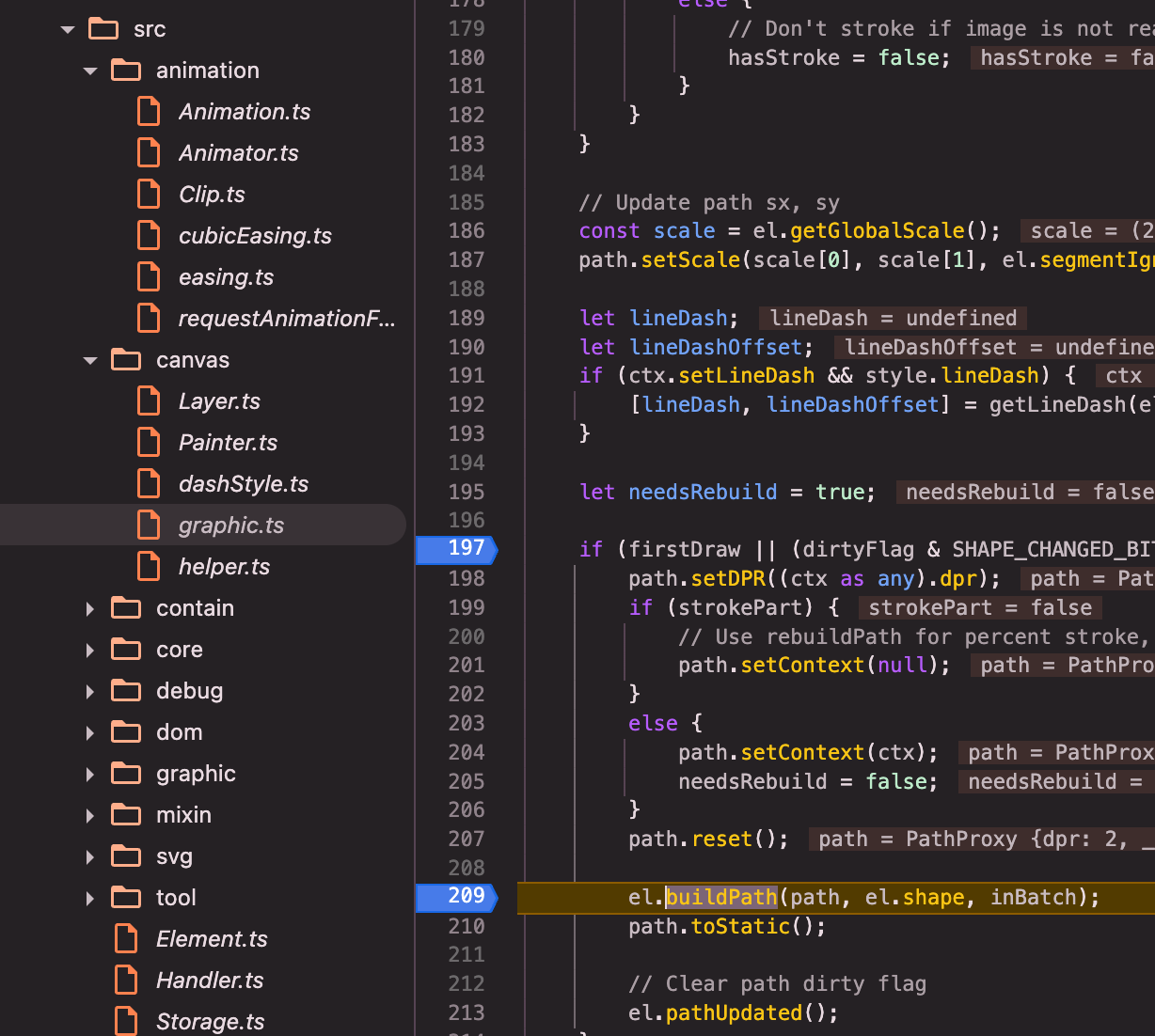 animation.start()开启帧动画渲染后,类似调试简单绘制过程,同样会调用:brush()=>brushPath()=>path.rebuildPath(ctx, strokePart ? strokePercent : 1);(在文件src/canvas/graphic.ts中) (rebuildPath这个方法比较典型, 其实也有其它子函数绘制逻辑,跟分层绘制、坐标变化等等有关)