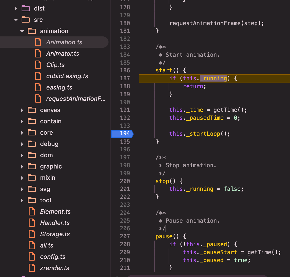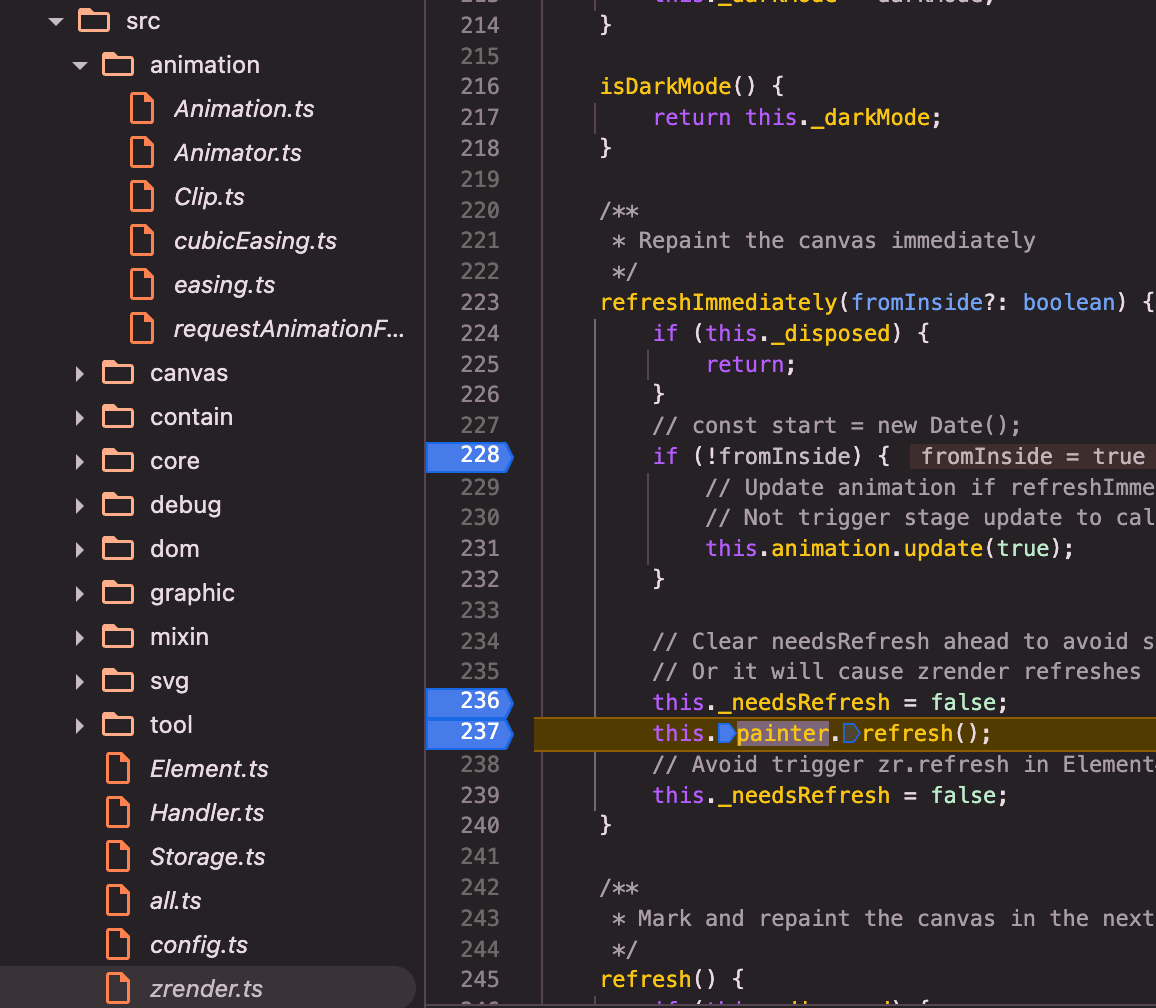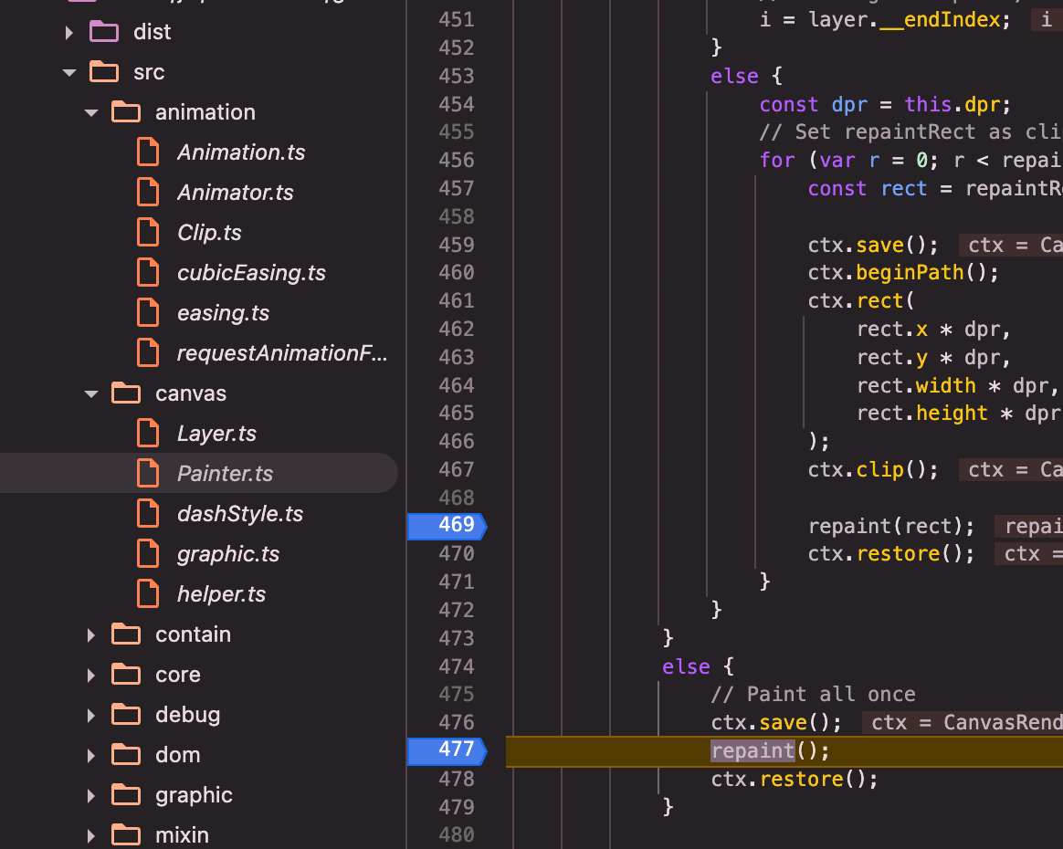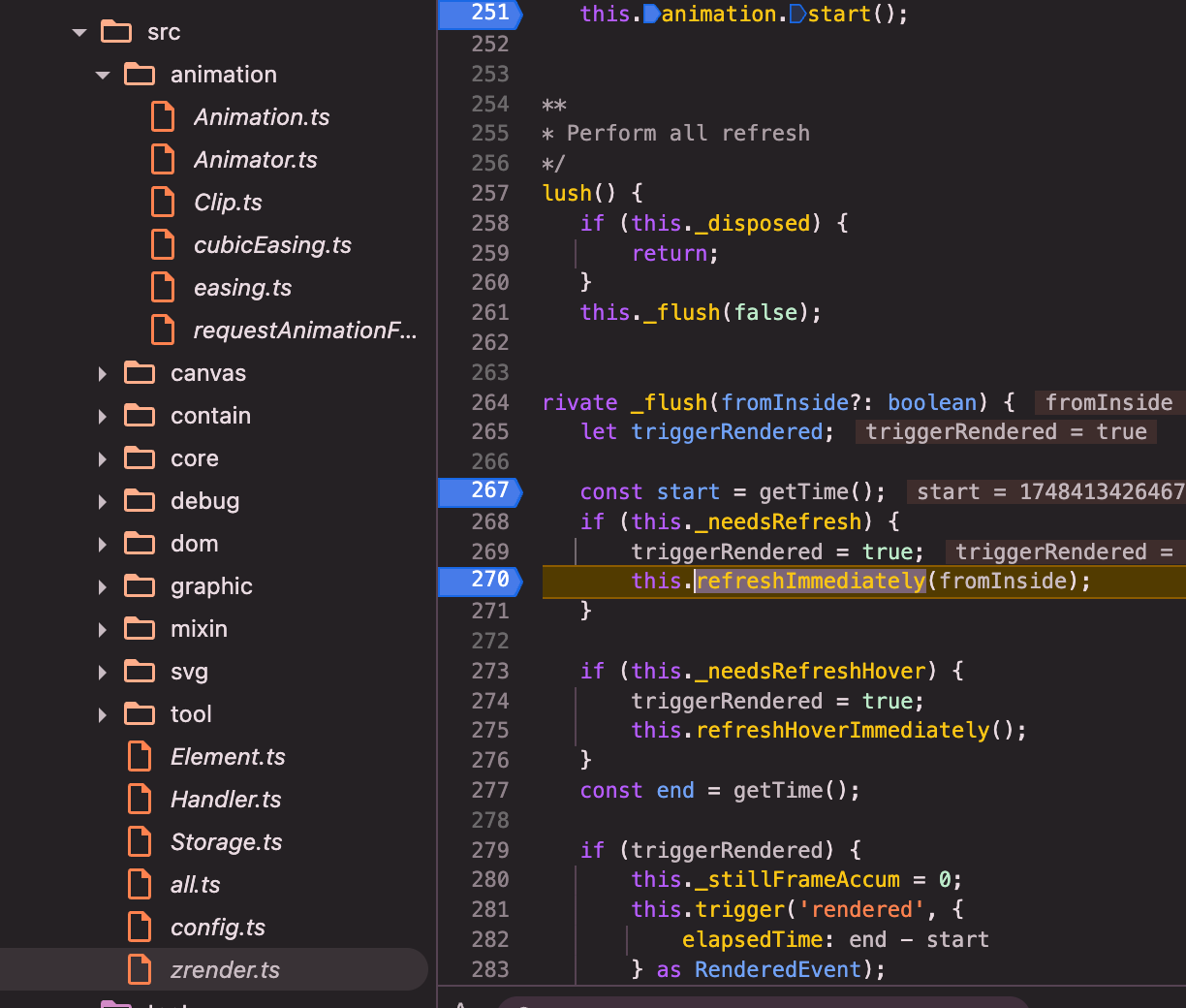 animation.start()开启帧动画渲染后,类似调试简单绘制过程,同样会调用:brush()=>brushPath()=>path.rebuildPath(ctx, strokePart ? strokePercent : 1);(在文件src/canvas/graphic.ts中) (rebuildPath这个方法比较典型, 其实也有其它子函数绘制逻辑,跟分层绘制、坐标变化等等有关)