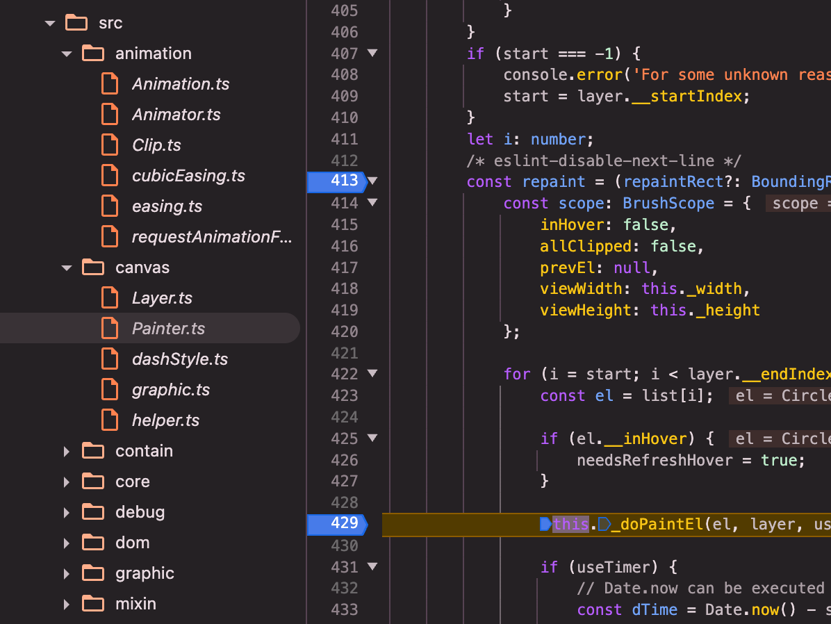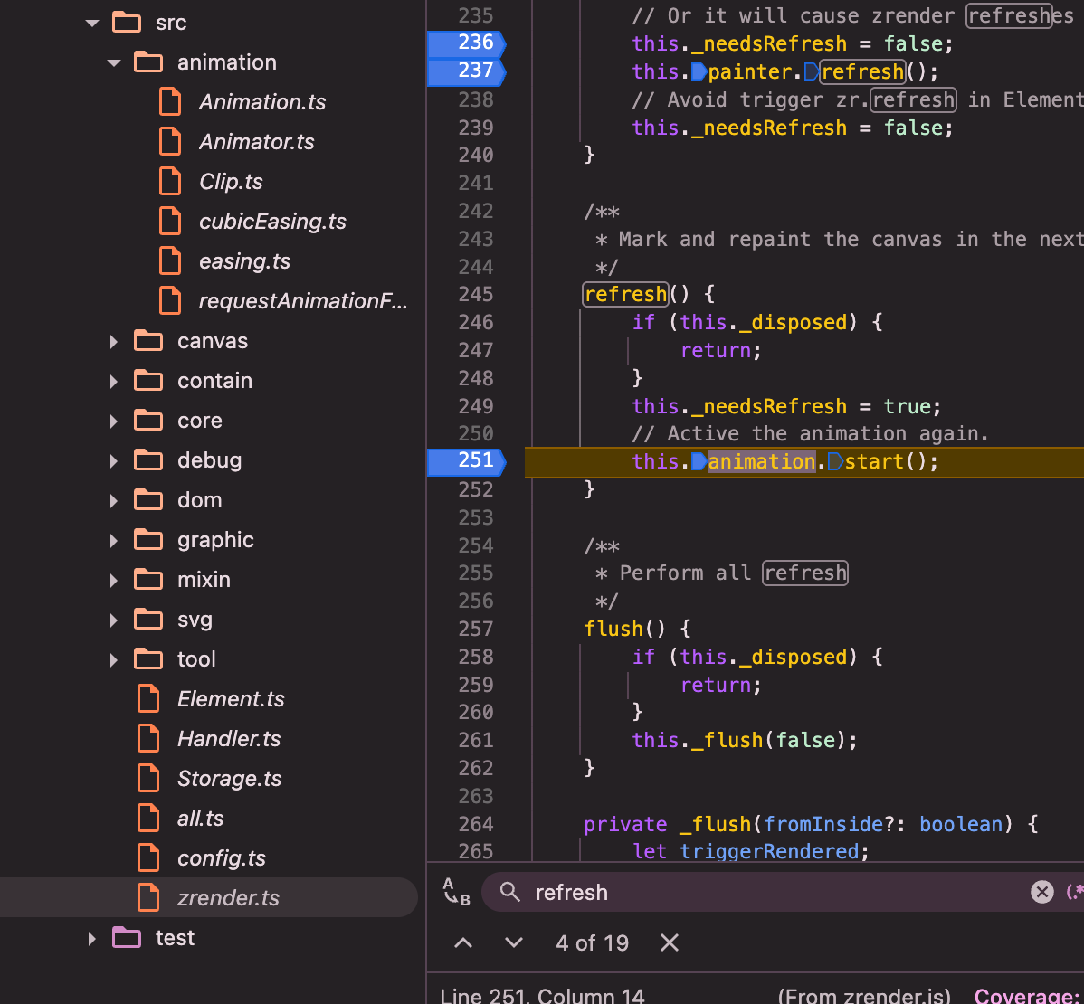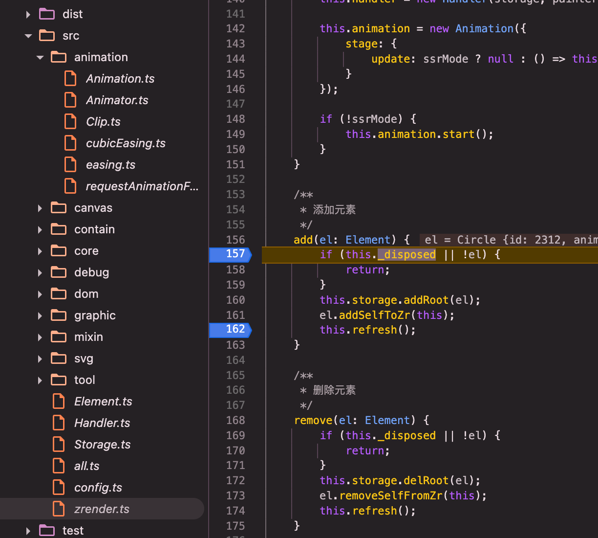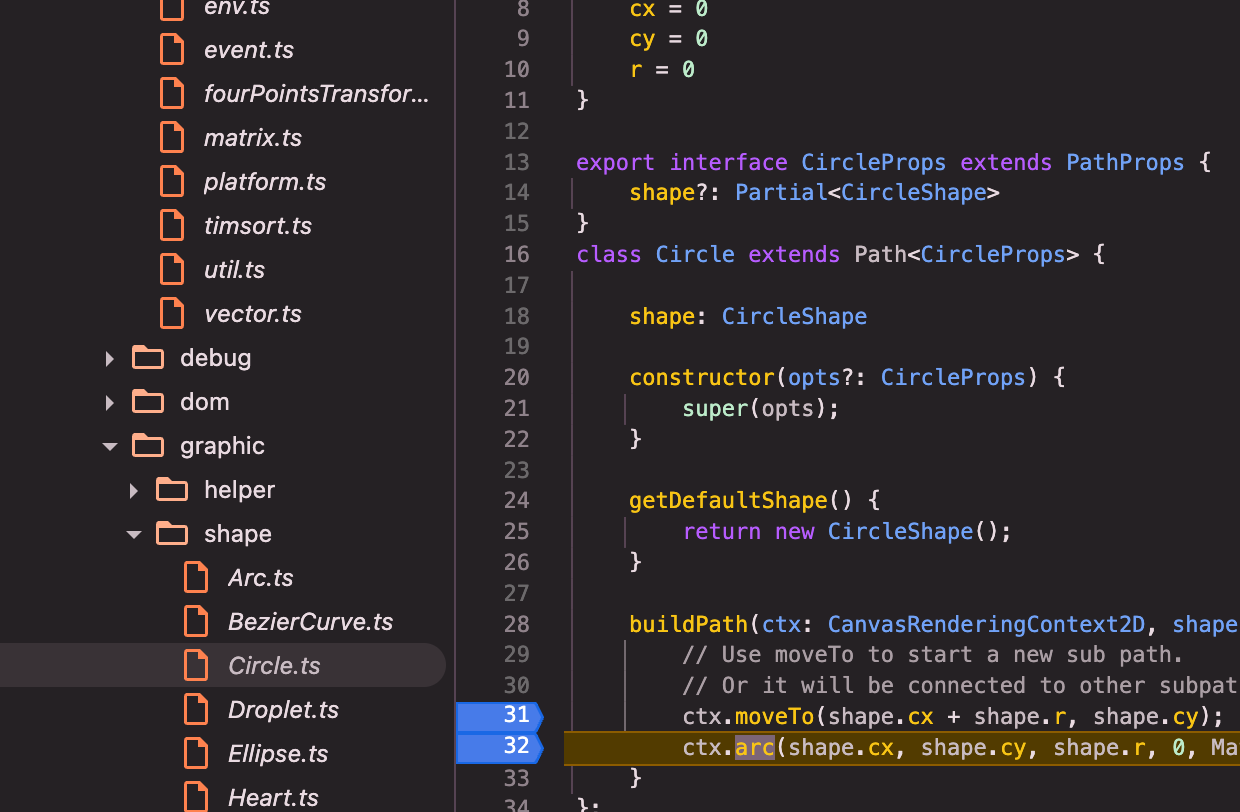 animation.start()开启帧动画渲染后,类似调试简单绘制过程,同样会调用:brush()=>brushPath()=>path.rebuildPath(ctx, strokePart ? strokePercent : 1);(在文件src/canvas/graphic.ts中) (rebuildPath这个方法比较典型, 其实也有其它子函数绘制逻辑,跟分层绘制、坐标变化等等有关)