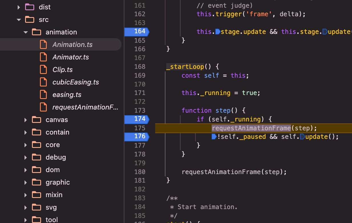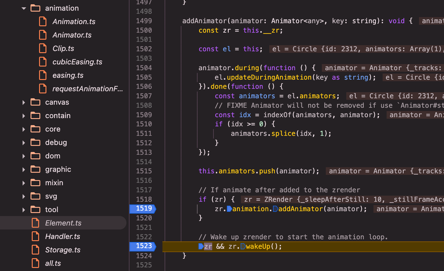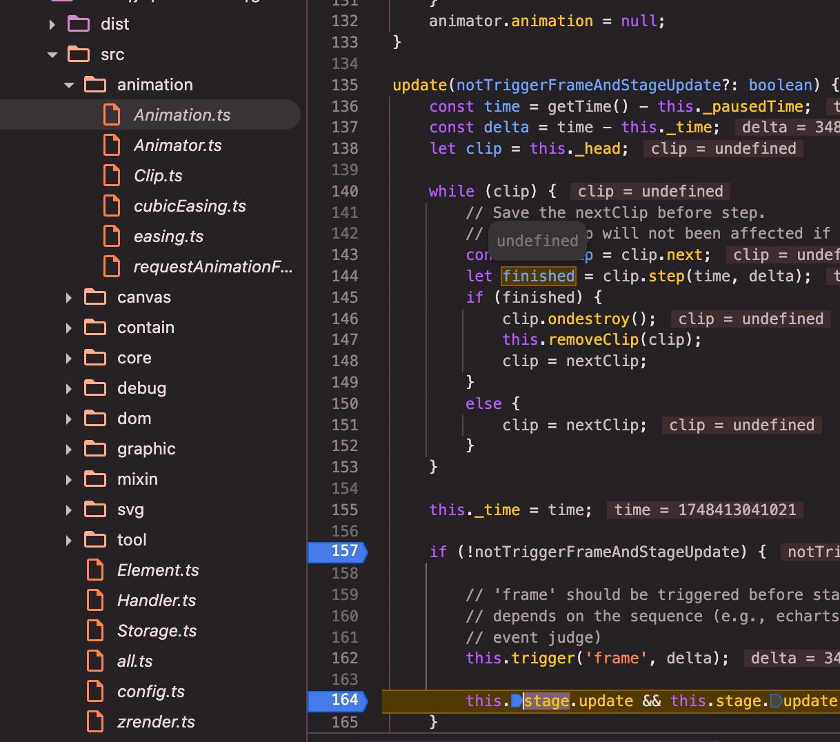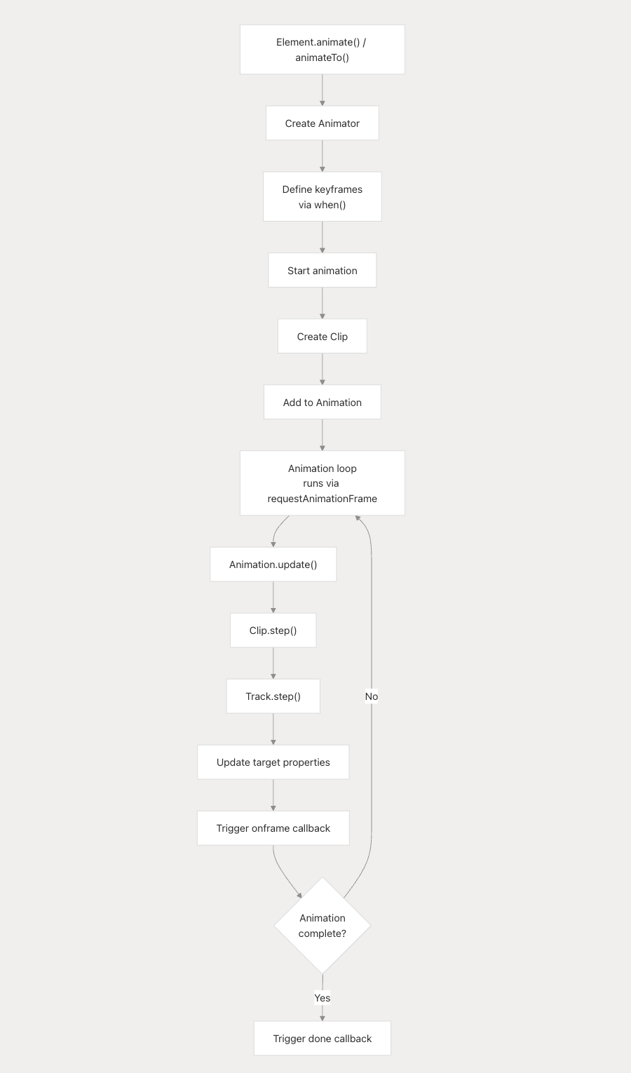 onframe即是在animator.start()中newClip时传入的onframe函数,clip的step方法会在每一帧调用这个函数来执行动画插值计算, clip的step的调用在上文解析中的animation.update()中遍历链表时调用的. (注意: 虽然circle.animate()中嵌套调用animation.update()会在circle.animate().when().start()的start前执行, 但在实际执行时,clip的step会在下一帧才会执行, 因为animation.start()中是通过requestAnimationFrame来实现的)