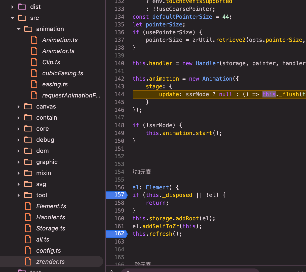 zrender:constructor赋值:annimation.stage.update为_flush()=>_flush()=>refreshImmediately()=>this.painter.refresh();