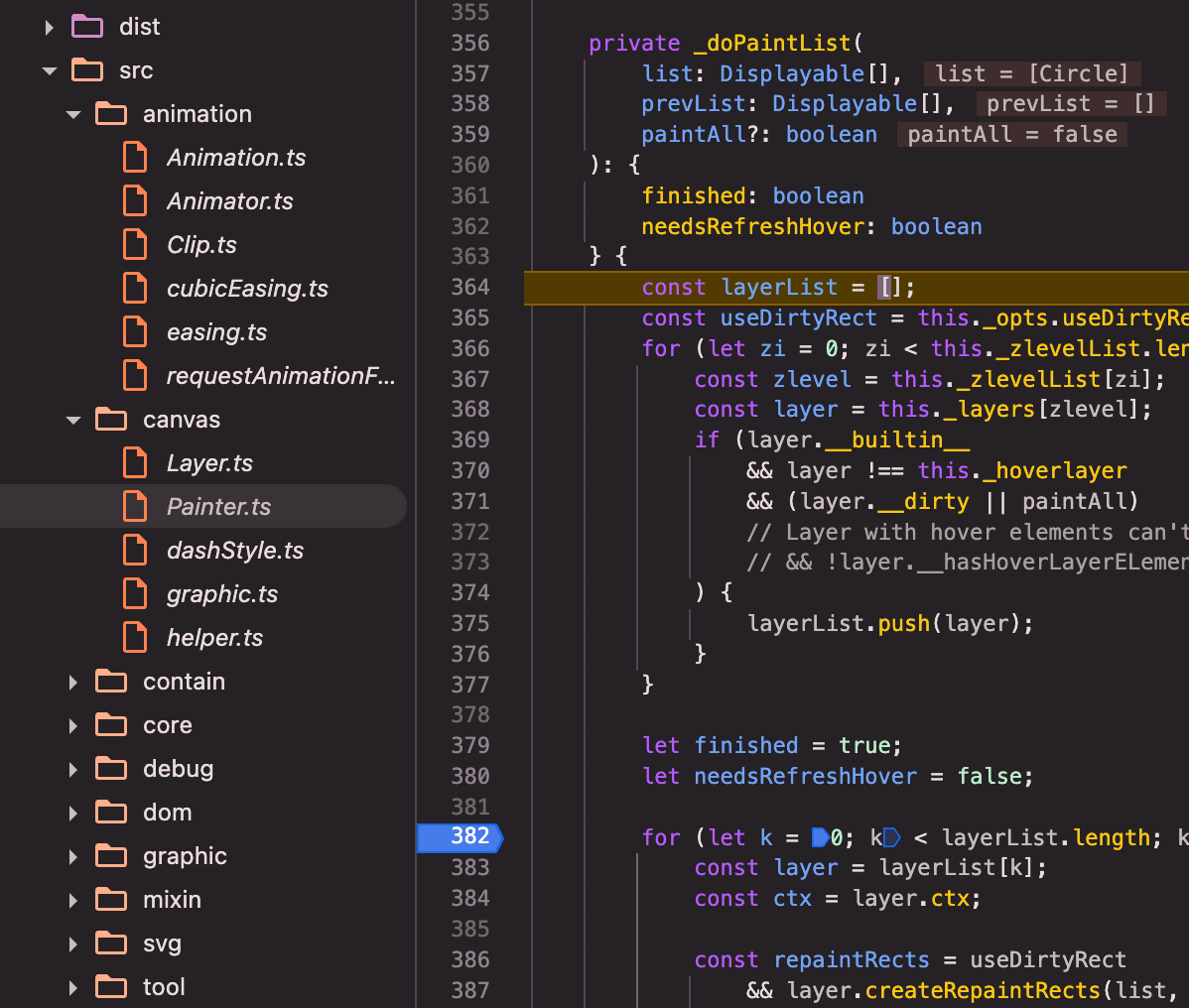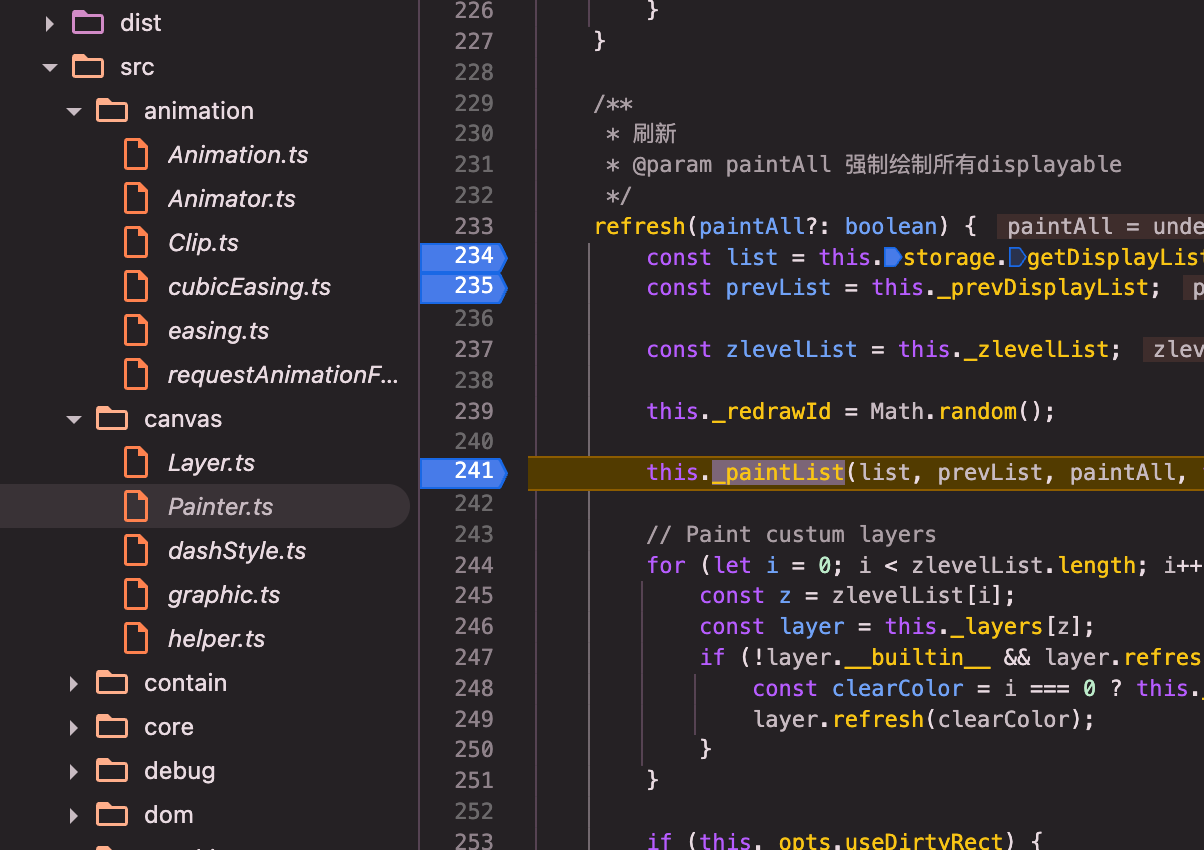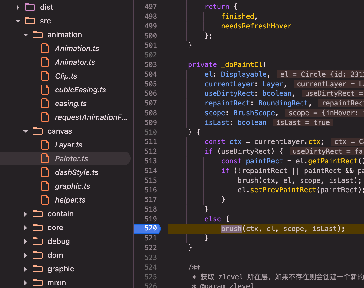 painter(以canvas painter为例src/canvas/Painter.ts):refresh()=>_paintList()=>_doPaintList()=>_doPaintList内部闭包repaint()=>_doPaintEl()=>brush()