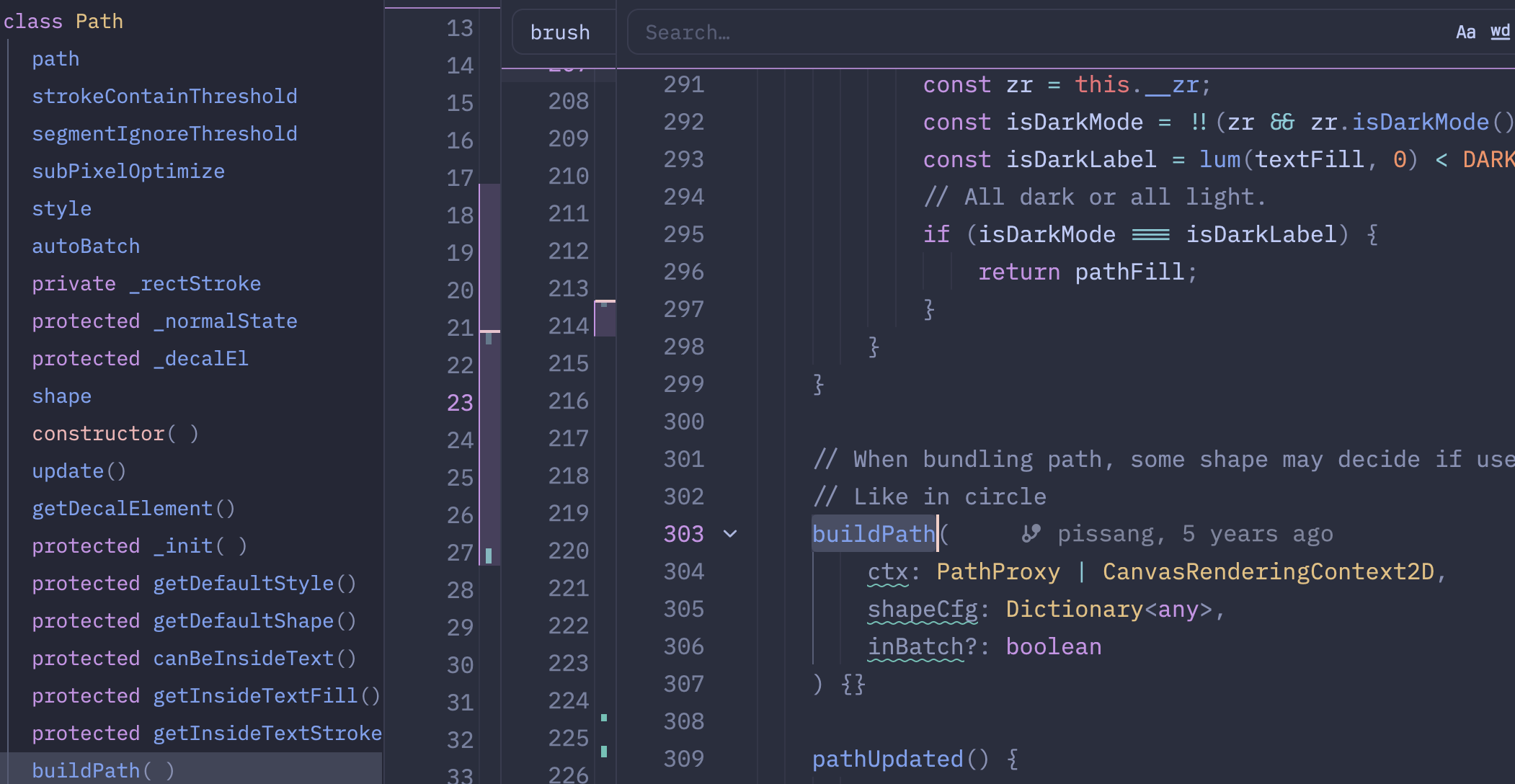 brush()(canvas的brush,src/canvas/graphic.ts):brush()=> bursh内部调用brushPath()=>brushPath()=> brushPath内部关键调用el.buildPath(path, el.shape, inBatch);