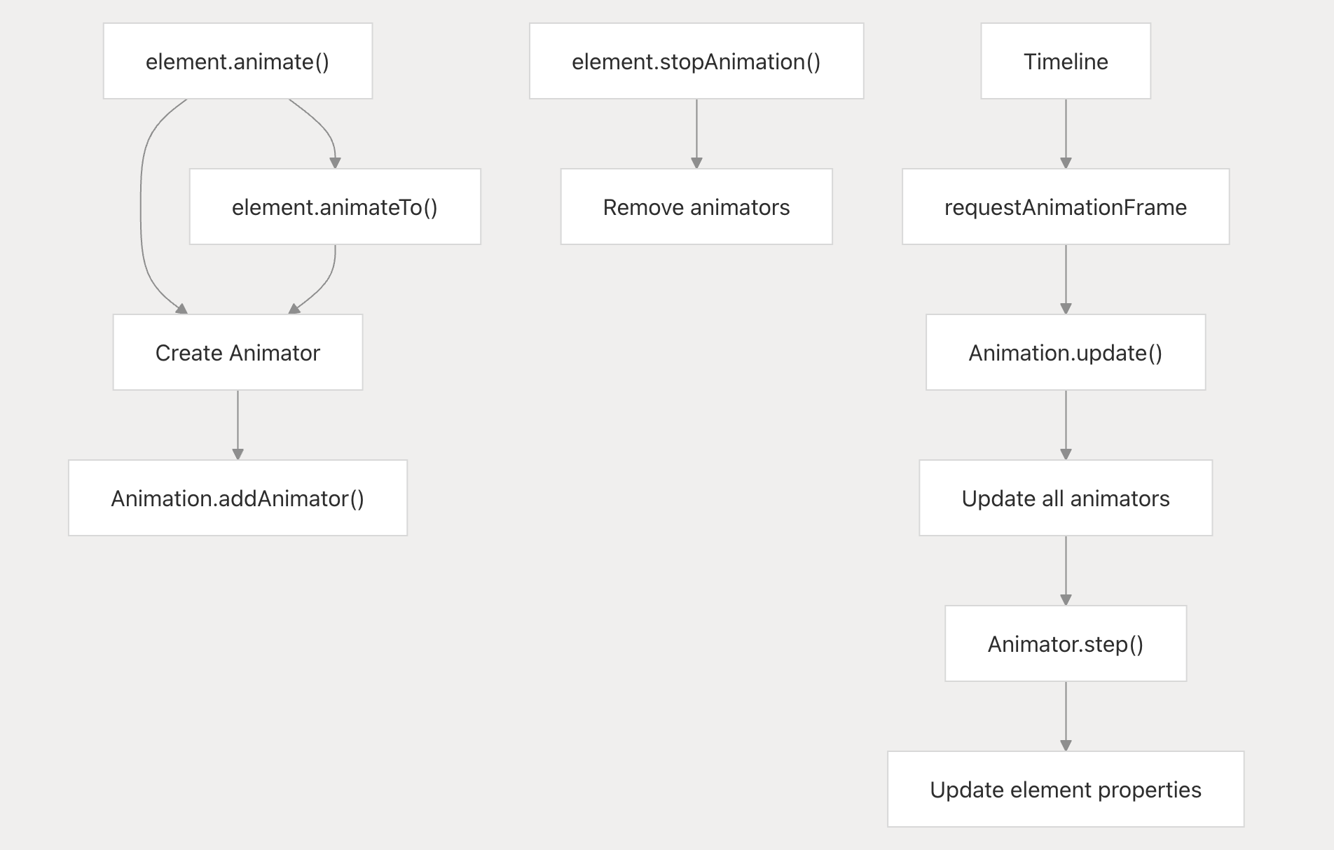 动画的绘制,主要是调用animation的start()方法实现,通过插值和重绘每一帧实现流程的动画。 每个动画都是通过requestAnimationFrame来实现的, 这个动画引擎性能很好,感觉也比较依赖浏览器的js执行效率,这说明浏览器中js的执行效率还是很高的。